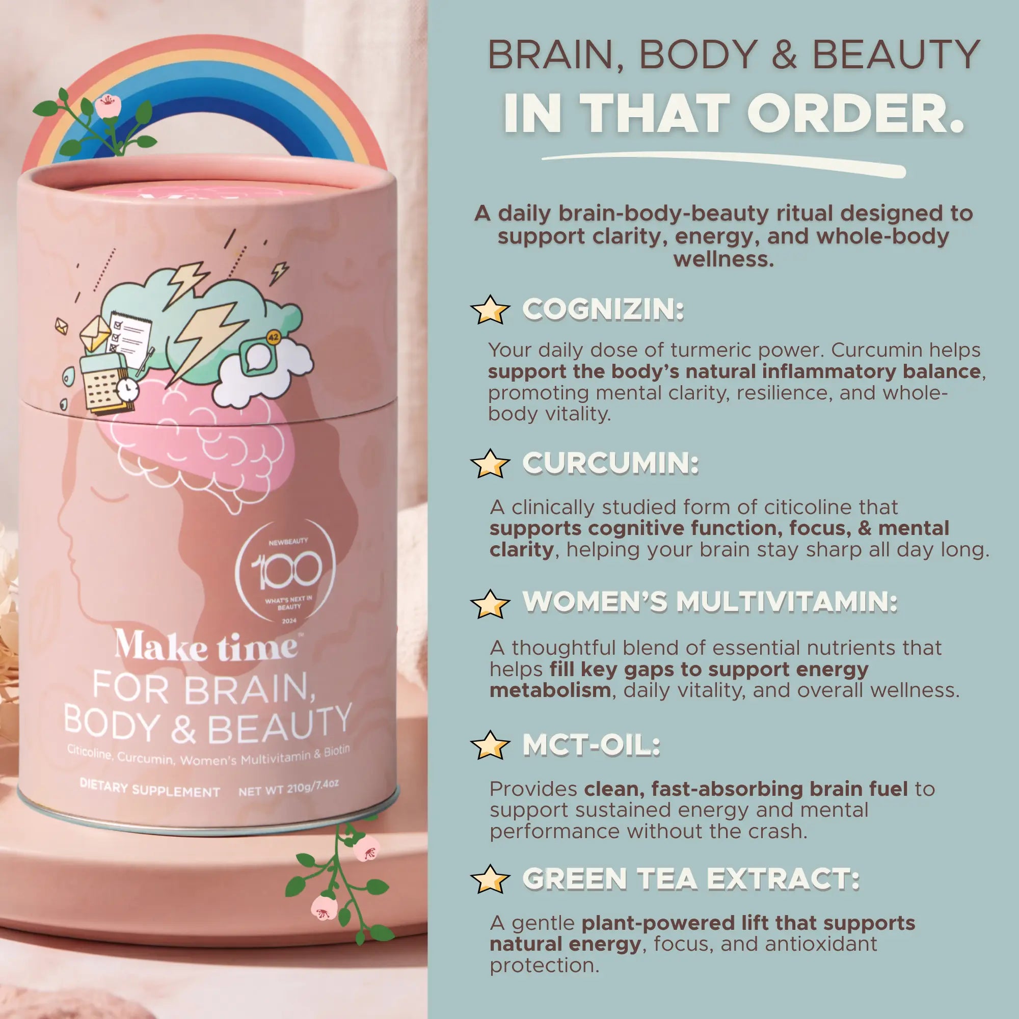 • Make Time for Brain, Body, & Beauty Powder – A powerhouse blend of essential vitamins, minerals, adaptogens, and antioxidants that supports mental clarity, skin hydration, and energy. Just scoop, sip, glow, and go!