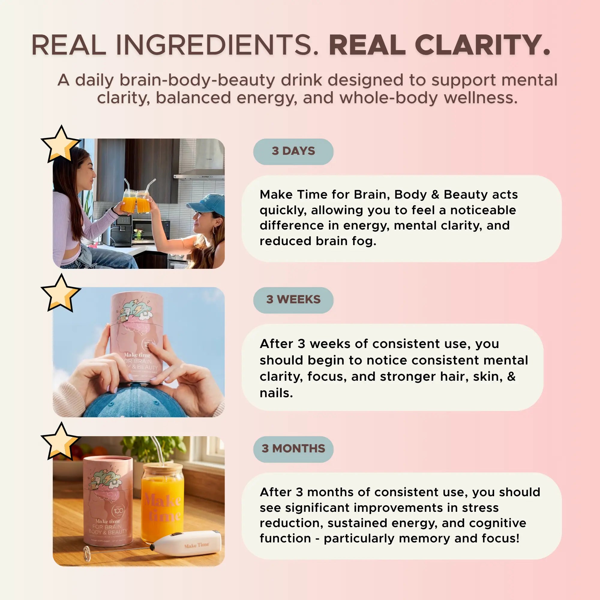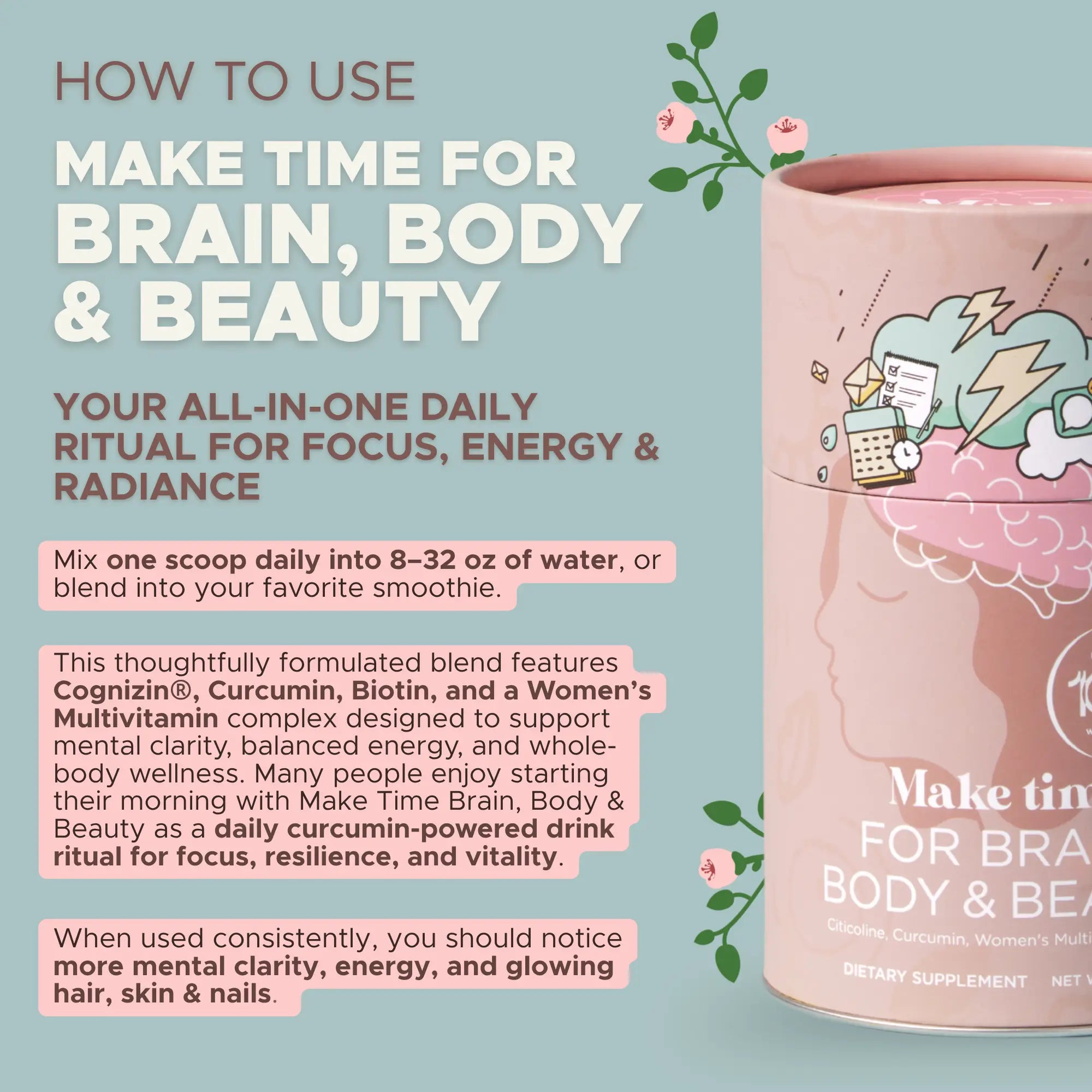 Consistency is key! Make Time every day and feel the difference over time with better focus, more energy, and radiant skin, all from a formula you can trust.